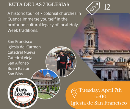 We invite you to be part of the 'Route of the 7 Churches' a journey through the history, culture, and architecture that define our city's deep-rooted family traditions. Together, we will discover the context and significance of this sacred tradition and uncover the fascinating origins of our seasonal traditional dish: Fanesca. Our guide—an actor portraying a prominent character from the colonial era—will share captivating cultural facts and historical events surrounding Holy Week (Semana Santa). The Journey Includes: • San Francisco • El Carmen • New Cathedral (Catedral Nueva) • Old Cathedral (Catedral Vieja) • San Alfonso • Buen Pastor • San Blas Welcome! Come and relive the traditions of Cuenca with us.