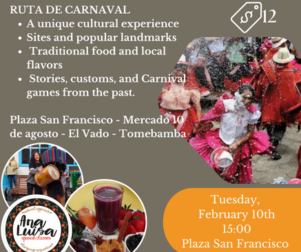 Join us on a guided route through traditional and iconic places, where history, culture, gastronomy, and traditional games come together to bring the old Carnival traditions back to life. •Historic sites and popular landmarks •Traditional food and local flavors •Stories, customs, and Carnival games from the past Places we will visit: • San Fransico Square • August 10th Market • El Vado Square • The banks of the Tomebamba river The Experience Includes: • A traditional carnival snack • the presence of a typical Carnival character • Stories, memories, and joyful interactions connected to these festive days Come and celebrate Carnival the way it used to be! Our guide will be an actor representing one of the characters from this important celebration.