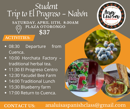 We invite you to join us on an immersive journey to El Progreso Parish (Nabón)! This is a unique opportunity to support local entrepreneurs and experience the authentic daily life of this beautiful community. Come and explore the traditions, flavors, and nature that make this region so special. Itinerary: • 08:30 AM | Departure from Cuenca. • 10:00 AM | Horchata Factory: Discover the secrets of this traditional herbal tea. • 11:30 AM | El Progreso Town Center: A walk through the heart of the community. • 12:30 PM | Yacudel (Beekeeping Experience): Learn about the production of honey, pollen, and handmade nougat. • 02:00 PM | Traditional Lunch: Enjoy a home-cooked meal in a local family residence. • 03:30 PM | Blue Paradise: Visit the charming alpine cabins and enjoy a 45-minute guided hike along the Blueberry Trail to observe local flora and fauna. • 05:00 PM | Return to Cuenca. Don't miss out on this cultural and natural adventure. Space is limited!